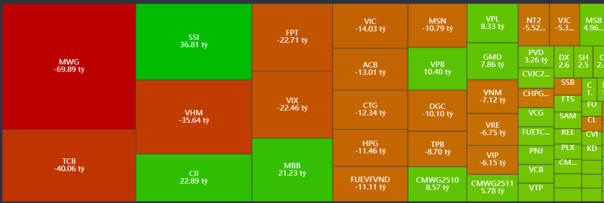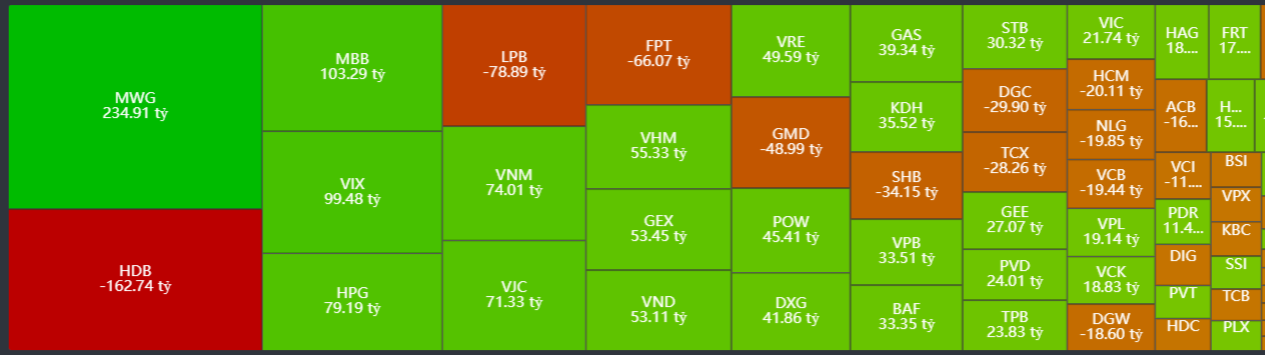 - Mua ròng tập trung: MWG, MBB, VIX, HPG, VNM,…