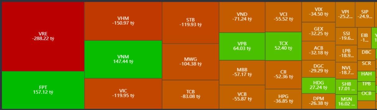 - Bán ròng tập trung: VRE, VHM, VIC, STB, MWG….