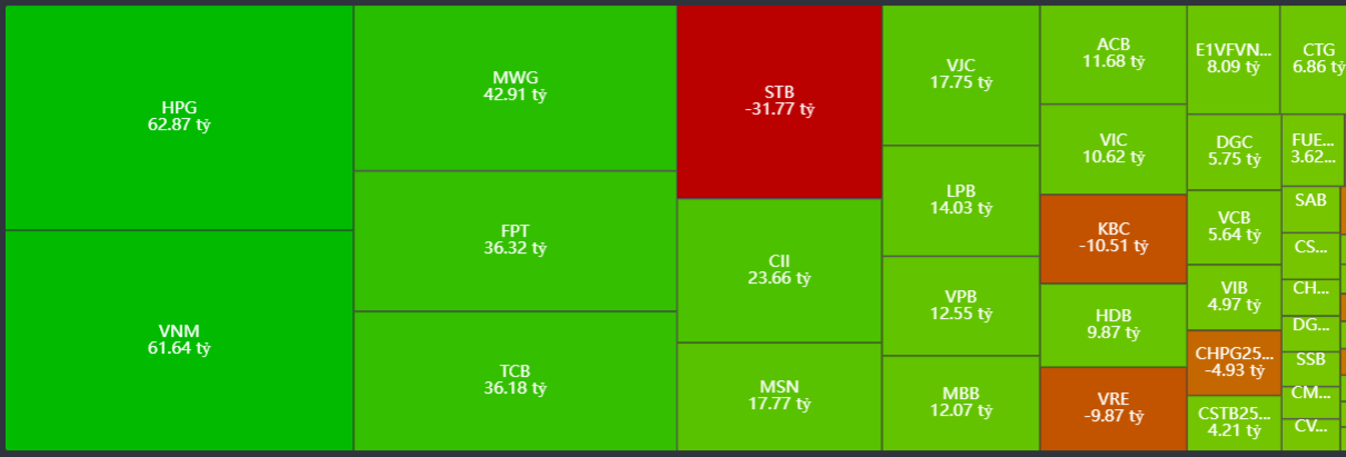 - Mua ròng tập trung: HPG, VNM, MWG, FPT, TCB,..
