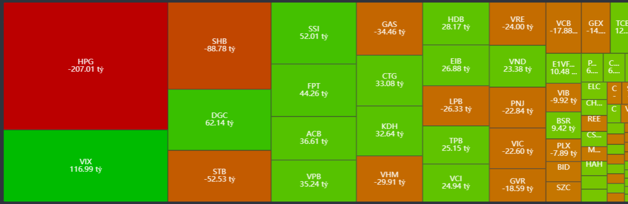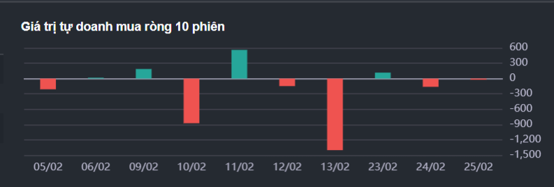 Khối tự doanh bán ròng nhẹ -22.49 tỷ đồng. Lực mua ghi nhận tại VIX, DGC, SSI, FPT, ACB, VPB, trong khi lực bán tập trung ở HPG, SHB, STB, GAS, VHM, LPB.