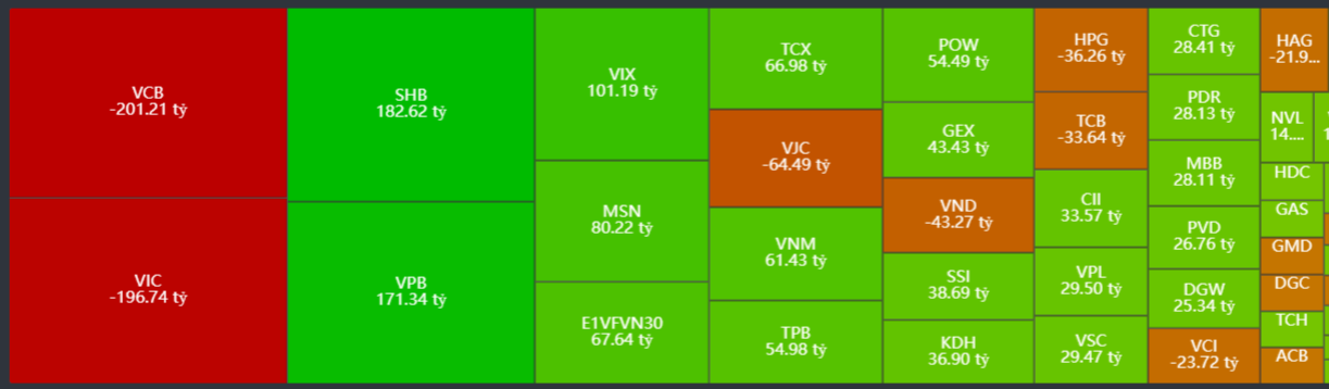 - Bán ròng tập trung: VCB, VIC, VJC, VND, HPG….