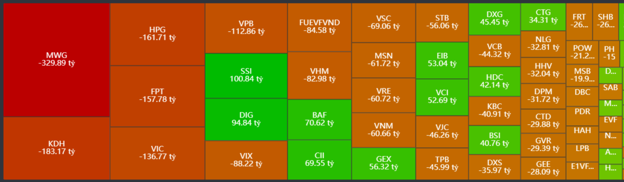 - Bán ròng tập trung: MWG, KDH, HPG, FPT, VIC,…