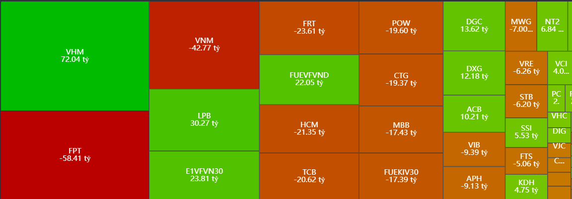 Ngược lại, khối tự doanh bán ròng mạnh các mã như FPT, VNM, FRT, HCM, và TCB. Sự bán ròng này đã tạo áp lực lên các cổ phiếu thuộc nhóm công nghệ và tài chính.