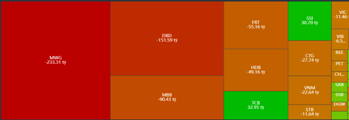 - Bán ròng tập trung: MWG, DBD, MBB, FRT, HDB,..