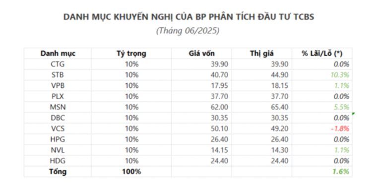 Trong bối cảnh đó, danh mục Top 10 cổ phiếu tiềm năng do các chuyên gia TCBS lựa chọn tính từ ngày 02/06 ghi nhận mức giảm nhẹ -0,8%, thể hiện khả năng chống chịu tốt của các mã cổ phiếu có nền tảng vững chắc. Dựa trên bức tranh vĩ mô cùng triển vọng kinh doanh tích cực năm 2025, danh mục đã có những điều chỉnh đáng chú ý.